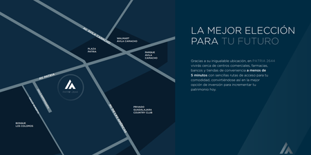 Gracias a su inigualable ubicación, en PATRIA 2644 vivirás cerca de centros comerciales, farmacias, bancos y tiendas de conveniencia a menos de 5 minutos con sencillas rutas de acceso para tu comodidad, convirtiéndose así en la mejor opción de inversión para incrementar tu patrimonio