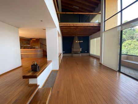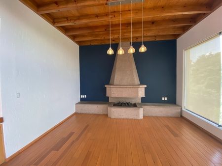 La sala se distingue porque permite caminarla fluidamente, a través de sus pisos de duela, una chimenea de cantera tallada, doble altura y como punto focal la vista al maravilloso bosque.