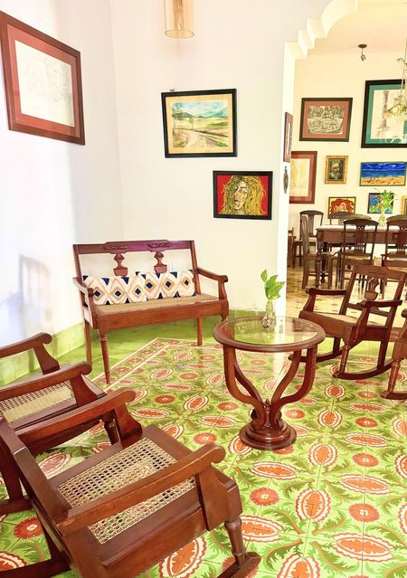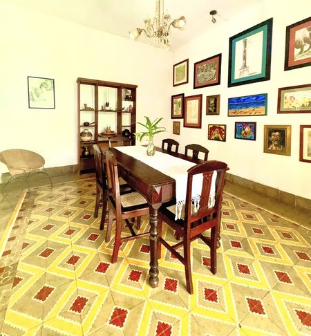 The photos showcase the spaciousness of the social areas, such as the living and dining rooms, decorated with local art that highlights the region's cultural identity. The kitchen, with its striking yellow tiles, is a functional and lively space. The bedrooms are cool and cozy, with wooden windows with color glass on top.