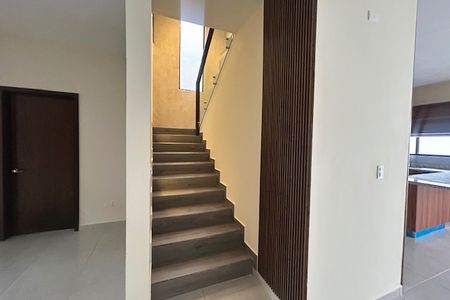 La casa cuenta con dos plantas, tiene cochera techada para dos autos, recibidor, baño de visitas, recámara en planta baja con baño completo, sala, comedor, cocina integral con barra desayunadora y alacena, lavandería cerrada, patio con asador, medio baño exterior para visitas, pasillo lateral, bodega.