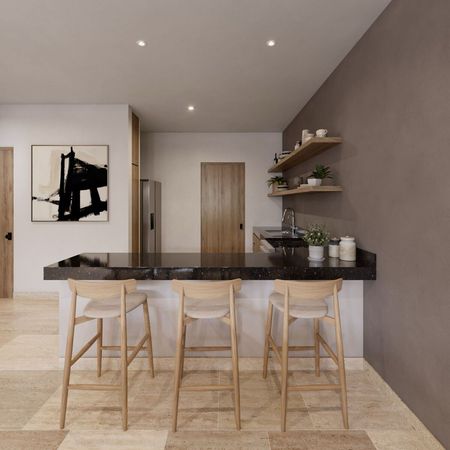 • Gabinetes inferiores, tarja de acero inoxidable y meseta de granito en cocina;