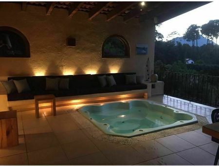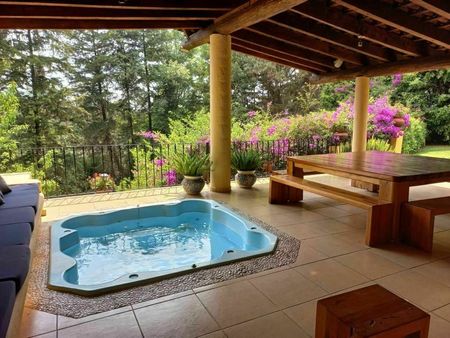 Casa de cuatro habitaciones con cuatro baños y hasta nueve lugares de estacionamiento. Despacho con vista al bosque. Suficiente espacio para hacer una quinta recámara. Jacuzzi.