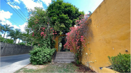 El acceso principal cuenta con una hermosa entrada con rejas altas y árboles que bordean el acceso. La entrada colinda al frente con la Iglesia de Itzincab, que data de principios del siglo XVI.