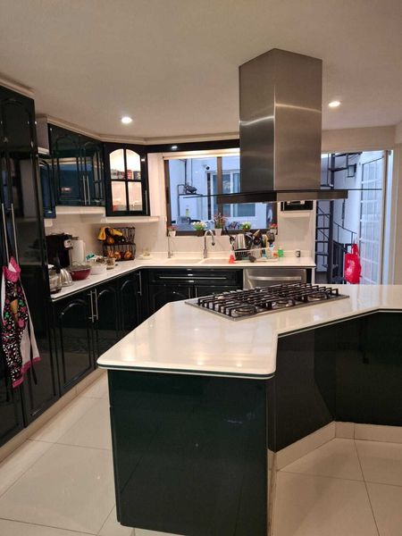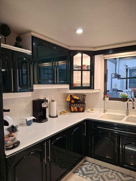 • La cocina integral es blanca con tabloide gris obscuro, área de almacenamiento de buen tamaño