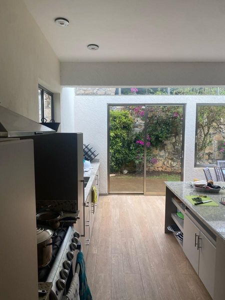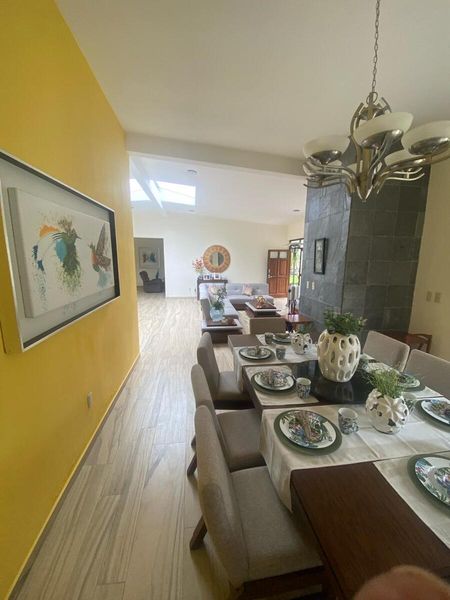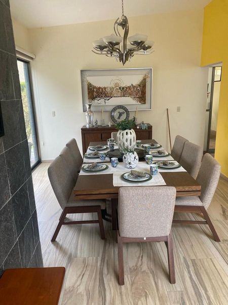 una hermosa estancia, amplio comedor cocina equipada y cinco recámaras con todas las comodidades y hay un espacio para el área de servicio con una habitación completa para la persona que nos ayuda en casa.