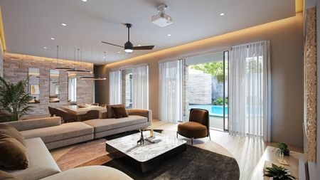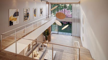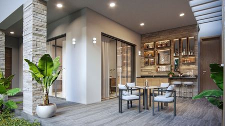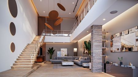 Hall Family & Fun de doble altura de 8m Hall Family & Fun de 98m2 y una altura de 8m con un doble ventanal de 6x7m para usos múltiples como Family TV, Sala de Juegos, Recepción, Proyección de cine, bar interior, espacio para reuniones o fiestas con vista al jardín con el gran ventanal de la Residencia. Se entrega en obra gris para la rápida colocación de pisos, baños, luminarias, aires, puertas, closets y demás acabados al gusto único y personal del comprador. Se incluye la edificación, instalaciones eléctricas, hidráulicas y sanitarias, así como el acabado principal de muros y pisos. También incluye la piscina terminada y los jardines interiores y exteriores. Tiene Iluminación exterior en fachada, Jardines, piscina, pasillos e interiores.