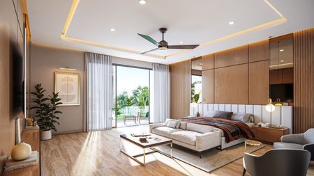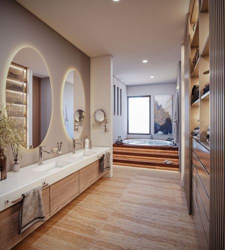Recámara principal con espacio para tina, doble lavabo y espacio para gran closet vestidor con vista al jardín y piscina, balcón y terraza (amplia) propios