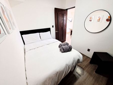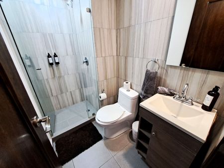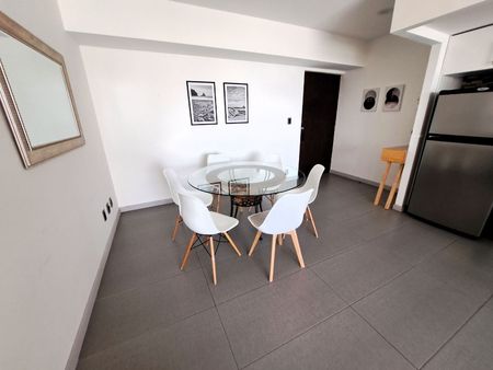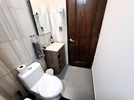 El máximo atributo de este departamento es su cálida área común con comedor y amplia sala con una pantalla de 43" y TV de paga, ideal para convivir con amigos o la familia después de ese día de trabajo o de tour por la ciudad. El departamento cuenta además con una recámara principal con cama tamaño queen y pantalla de 32" con Roku streaming. Adicionalmente su segunda habitación cuenta con una cama una tamaño matrimonial y un amplio closet. Su cocina es tipo americana y está equipada con lavadora-secadora, dispensador para garrafón de agua, refrigerador, microondas, cafetera, tostadora, licuadora así como utensilios, vajillas, vasos, copas, refractarios y sartenes para preparar cualquier platillo. Hay cobertura de WiFi de banda ancha en todo el departamento así como en las diversas áreas públicas.