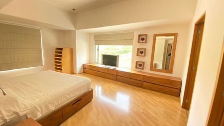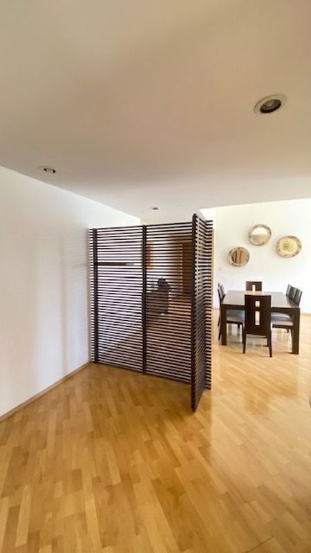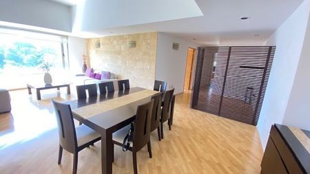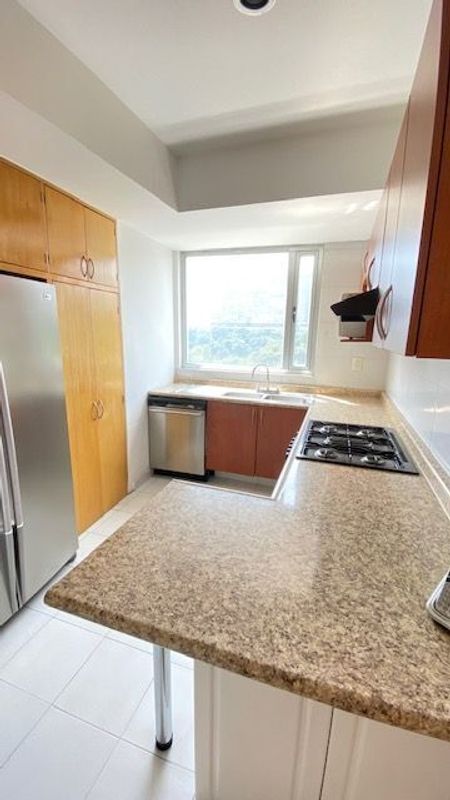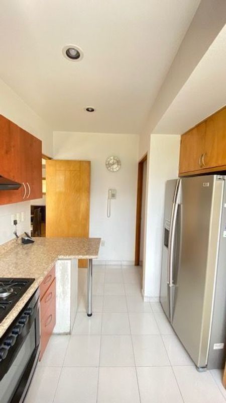 Departamento de 161m2. Sala, comedor, cocina, servicios integrados, 3 recámaras, 2 baños. 2 estacionamientos. Iluminado y calientito. Áreas comunes: gimnasio, jardín con juegos infantiles, salón de fiestas, salón de yoga, asadores, ludoteca, tennis. Alberca.