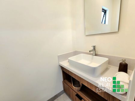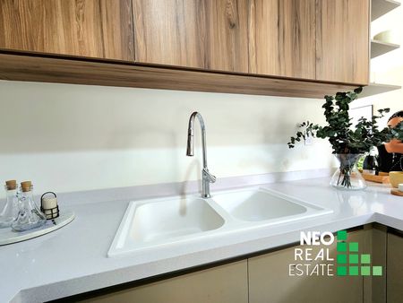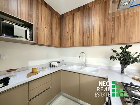 Esta espectacular residencia nos recibe con un amplio espacio de sala comedor, una cocina divina!! con cubierta de cuarzo sileston, tarja de de cuarzo blanco con iones de plata.