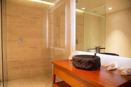 - **Marble shower area**, with **NOKEN recessed showerhead and handheld shower**