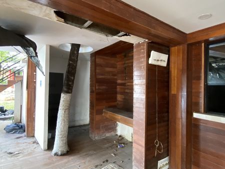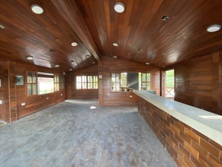 Planta alta: área de barra, baños, terraza con vista a la laguna.