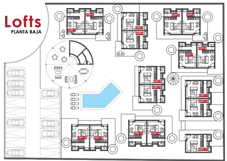 Algunos de estos lofts o villas cuentan con un espacio de roof garden parcialmente techado por medio de paneles solares , sujetos a una estructura metálica.Diseño y Distribución: