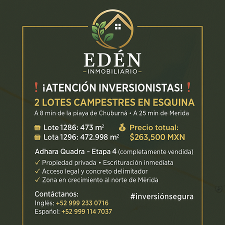 Located only 8 minutes from Chuburná Beach and 25 minutes from Mérida, these two adjoining country lots on a corner offer an incredible opportunity for both small and large investors looking for future growth and solid returns.Inside Adhara Quadra – Stage 4 (COMPLETELY SOLD OUT!)