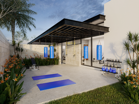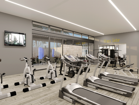 -Gimnasio con área de cardio, máquinas y pesas y espacio abierto.