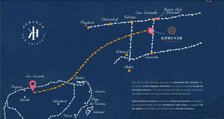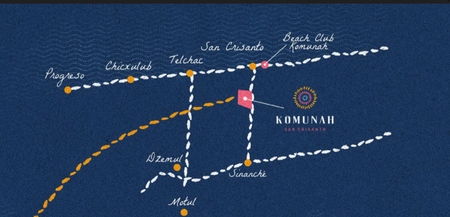 Uno de los más valiosos atributos de Komunah San Crisanto, es sin duda, su privilegiada ubicación. El complejo se erige al pie de la carretera estatal. Komunah San Crisanto se localiza a menos de una hora de trayecto en automóvil desde la ciudad de Mérida, y sólo 4km lo separan de las playas de San Crisanto.