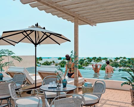 Rooftop: área común con alberca, bar, zona pet-friendly, juegos infantiles y vista