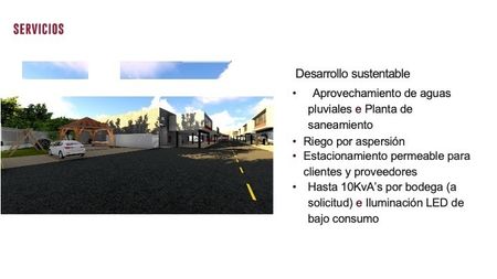 Bodegas corporativas con oficina y zona de carga, áreas verdes y de esparcimiento, compatibilidad con usos comerciales, seguridad 24h y videovigilancia, acceso controlado y reglamento interno.