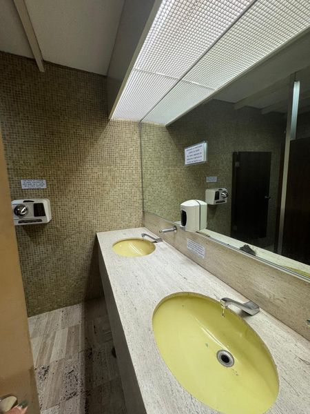 Baños para mujeres y hombres en cada medio piso de la escalera.