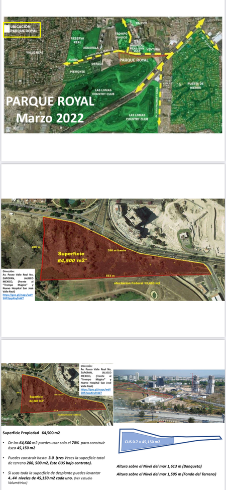 Excelente oportunidad de inversión para desarrollar un proyecto comercial en la mejor zona de Guadalajara, Jalisco; la zona real, uso de suelo mixto,rodeado del prestigioso club de golf "LAS LOMAS",el fraccionamiento VALLE REAL, PIEMONTE, RESERVA REAL, ALADA,ACUARELA, el nuevo HOSPITAL REAL SAN JOSE, a 3 minutos de PLAZA ANDARES Y LANDMARKM, a 2 minutos de PUERTA DE HIERRO y las avenidas mejor ubicadas como Acueducto y Patría, Periférico Norte como vía de acceso.