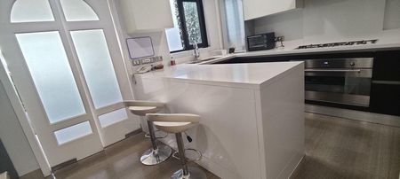 Cocina italiana de grafito equipada con estufa, extractor, refrigerador doble lava vajillas y horno marca Smeg.