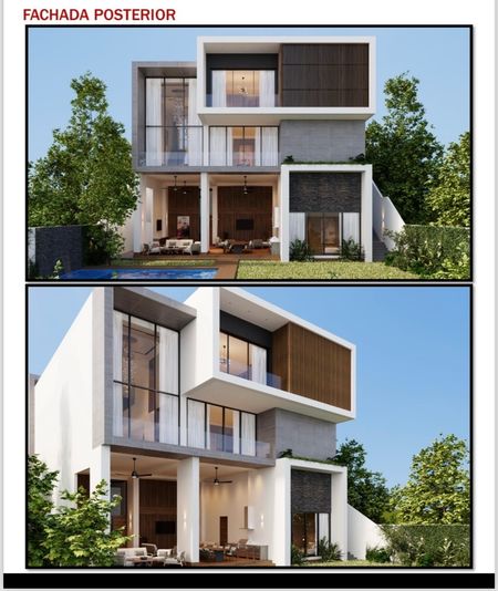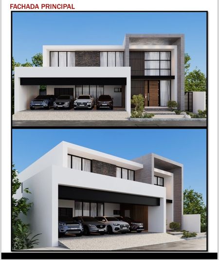 Cochera techada para 4 vehículos. Acceso principal con recibidor, cubo de elevador y escalera a planta alta, Sala en doble altura, bar, comedor con balcón techado, baño de visitas, cocina con family room y antecomedor, despensa, cuarto de lavado, cuarto de cine con opción a recámara con baño completo y vestidor, walk-in closet, nicho de equipos, y bodega.