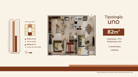 Tipología 1.- 82 mts2, 77 interior - 5 exterior. Precios desde $7,320,000 MXN.