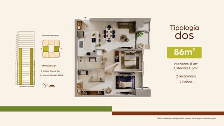 Tipología 2.- 86 mts2, 81 interior - 5 exterior. Precios desde $7,370,000 MXN.