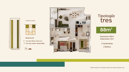 Tipología 3.- 88 mts2, 83 interior - 5 exterior. Precios desde $7,620,000 MXN.