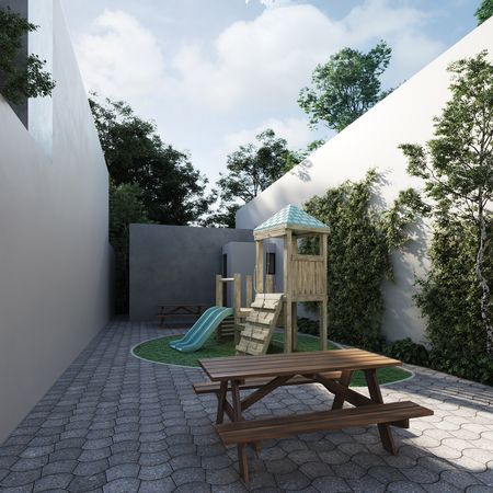 Cuenta con áreas comunes divididas en dos secciones, en una sección se encuentra la casa club con área de asadores y alberca; en la otra se encontraran los juegos infantiles y el cardio room.