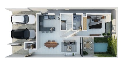 Cochera para dos autos sin techar, sala a doble altura, comedor, cocina con barra desayunadora y alcena, recámara con baño, medio baño.