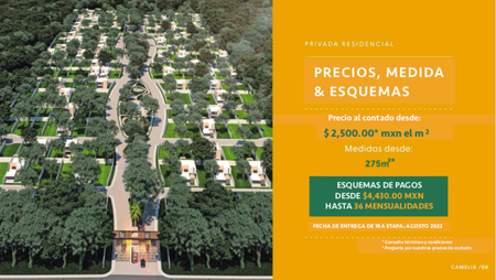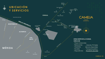 Zona de alta plusvalía, ubicada a tan solo 7 km del periférico de Mérida, cerca de Plazas Comerciales (Altabrisa), Hospitales, Restaurantes, Escuelas y a 35 minutos de la playa. La privada Camelia esta compuesta por 259 lotes para entregar en 3 etapas (1a. Etapa vendida al 95%) y cuenta con diversas amenidades como Areas de Recreación y Workout Courts, Casa Club, Outdoor Meet & Grill Area, Piscina, Cancha de Pádel, Cancha de Basquetbol, de futbol 7, Circuito de Jogging, Accesos para discapacitados, Espacios Pet Friendly y Areas de Leash Off, además toda su infraestructura es subterránea.