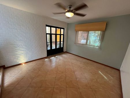 Terraza con 2 bodegas, área techada y hermosos árboles.