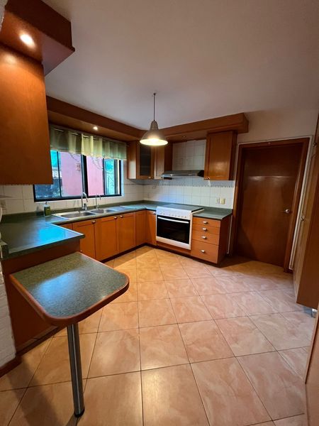 Cocina integral con vista a la terraza, estufa con horno y campana, barra desayunadora y amplias alacenas, filtro de agua, triturador de alimentos, doble tarja y un cuarto de servicio con baño completo, cuarto de lavado y patio de servicio.