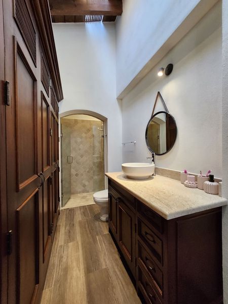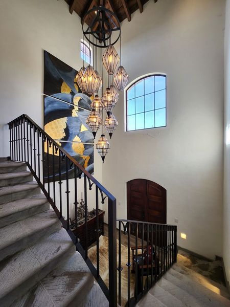 Primer Nivel: Al ingresar, te recibe un impresionante vestíbulo de triple altura, adornado con lámparas de diseñador y obras de arte con detalles en hojas de oro. Al centro, un espejo de agua con una escultura del Arcángel Miguel da la bienvenida. La cocina es muy amplia y cuenta con acabados de granito importado, ideal para disfrutar de momentos en familia. El área de sala, comedor y bar ofrece un espacio generoso, con capacidad para un comedor de hasta diez personas. La casa se vende amueblada, incluyendo utensilios de cocina.