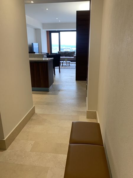 - Paredes en pasillos con el característico recubrimiento de madera de nogal.