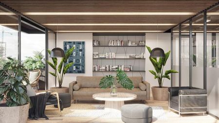 El proyecto se integra en una torre de usos mixtos, ofrece al espacio de oficinas servicios comerciales y posibilidad de hospedaje.