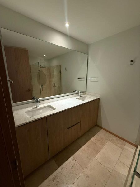 Cuenta con dos recámaras, sala-comedor, cocina abierta, centro de lavado, dos baños completos, baño de cortesía y dos cajones de estacionamientos.