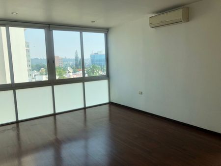 Descripción: Departamento en venta justo enfrente del parque Los Colomos. Consta de sala y comedor con vista al parque, cocina integral, medio baño para visitas. Dos recámaras; cada una con su baño y clóset y un estudio, 4 A/C incluidos y cortinas en todo el inmueble.