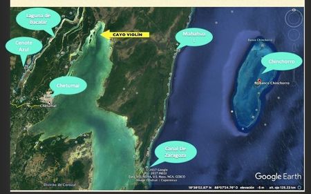 La Isla “Cayo Violín” se ubica en la Bahía de Chetumal "Santuario del Manatí", frente al Banco Chinchorro.