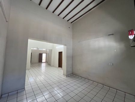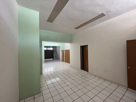 Recepción, dividido en diferentes secciones, área de juntas o firma, espacio techado con portón eléctrico para dos autos, medio baño de visitas, privado con baño completo, área de cocina, bodega y patio.