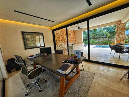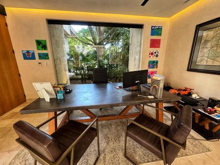 Del lado izquierdo del recibidor encontrarás un amplio despacho que tiene una ventana enorme que encuadra una ceiba impresionante y del lado derecho hay un baño de visitas.