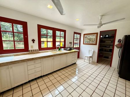 - Terraza principal con cocina integral, baños, alberca y bodega