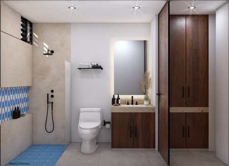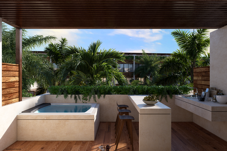 Recamara 3 con baño propio, closet y una pequeña terraza, bar–roof top.