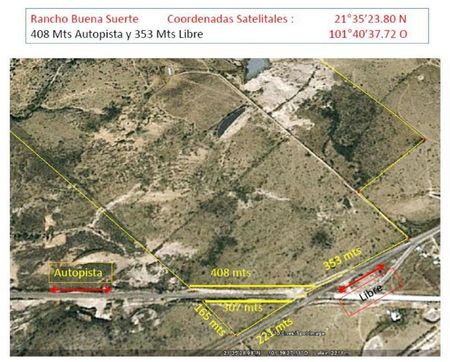 Terreno ubicado en "Las Amarillas o también conocido como "Las Jaras", en Ojuelos de Jalisco. Con superficie de 470-72-40 hectáreas, menos 02-05-62 hectáreas que le fueron segregadas por el Gobierno Federal por el cruce de la autopista Lagos de Morenos - San Luis Potosí, contando con un frente de 408mts. y con un frente de 353mts. a la Carretera Libre de Lagos de Moreno - San Luis Potosí.