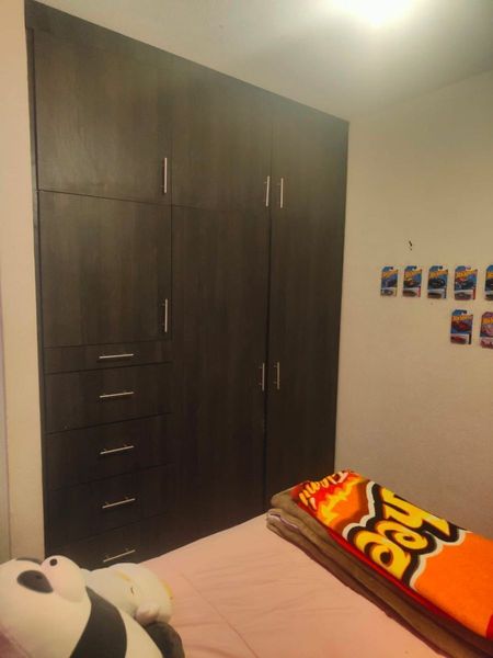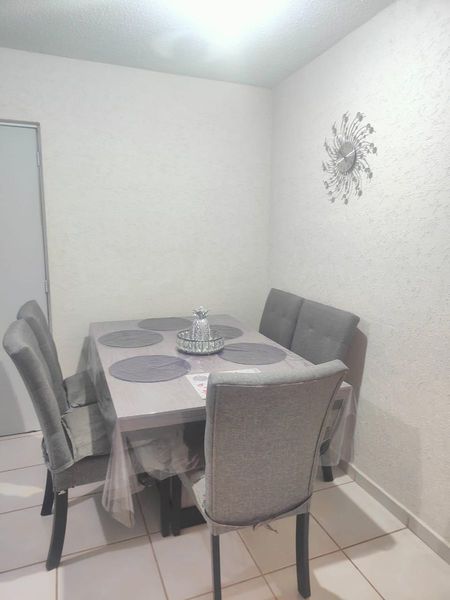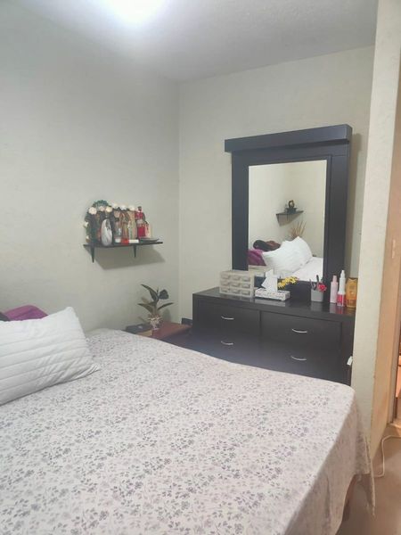 Sala, comedor, cocina integral, baño completo, 2 recámaras (Closet en una recámara), ampliación para guardarropa en recámara principal, jardín con pasto sintético nuevo, pasillo y patio encementados, herrería.