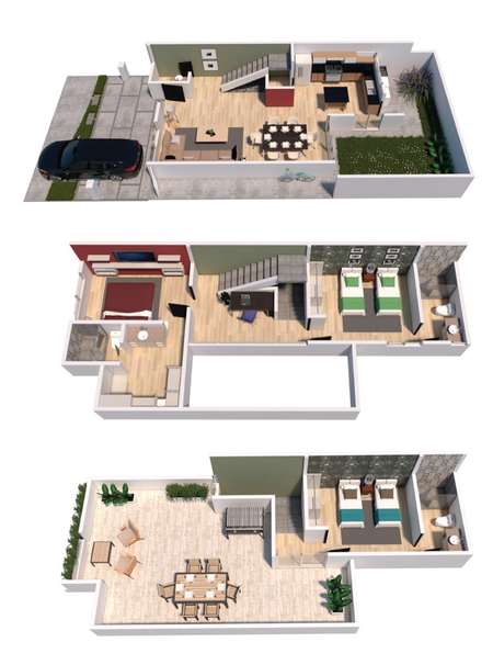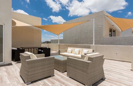 Casa en privada con diseño contemporáneo, consta de 3 recamaras con baño completo sala comedor con doble altura, cocina equipada, jardín y amplio roof garden.