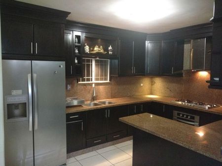 PLANTA BAJA: SALA, COCINA DE CEDRO CON PLACA DE GRANITO, COMEDOR, 1/2 BAÑO, CUARTO DE LAVADO, PATIO MUY MODERNO CON ASADOR Y FUENTE, UNA PEQUEÑA BODEGA, COCHERA TECHADA PARA 2 CARROS