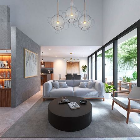 espacios abiertos y dobles alturas, con una gran terraza y área de alberca. Ubicado en la zona de Cholul a escasos minutos del periférico de Mérida.