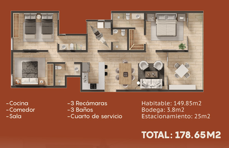 Distribución:CocinaComedor Sala3 Recamaras 3 BañosCuarto de servicioM2 Habitables: 149.85Bodega: 3.8Estacionamiento: 25Total: 178.65m2